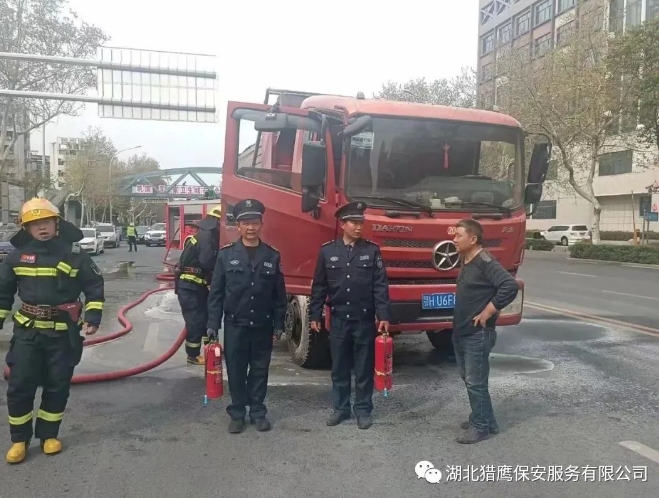 面對(duì)突如其來(lái)的變故,貨車司機(jī)緊急停車,下來(lái)時(shí)由于過(guò)度緊張,以至于重重摔倒在地,當(dāng)時(shí)司機(jī)疼痛難忍,更不知何滅火。危急關(guān)頭,我公司駐荊楚理工學(xué)院東門的保安員金鵬程(男,55歲,中共黨員,荊門城區(qū)人)和趙兵(男,55歲,漳河新區(qū)人)發(fā)現(xiàn)險(xiǎn)情后,迅速?gòu)闹蛋嗍姨崞饻缁鹌鳑_向著火的貨車,一左一右對(duì)準(zhǔn)起火部位進(jìn)行噴射滅火。