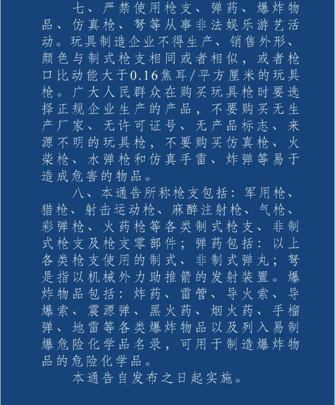 七、嚴(yán)禁使用槍支、彈藥、爆炸物品、仿真槍、弩等從事非法娛樂(lè)游藝活動(dòng)。玩具制造企業(yè)不得生產(chǎn)、銷(xiāo)售外形、顏色與制式槍支相同或者相似,或者槍口比動(dòng)能大于0.16焦耳/平方厘米的玩具槍。廣大人民群眾在購(gòu)買(mǎi)玩具槍時(shí)要選擇正規(guī)企業(yè)生產(chǎn)的產(chǎn)品,不要購(gòu)買(mǎi)無(wú)生產(chǎn)廠(chǎng)家、無(wú)許可證號(hào)、無(wú)產(chǎn)品標(biāo)志、來(lái)源不明的玩具槍?zhuān)灰?gòu)買(mǎi)仿真槍、火柴槍、水彈槍和仿真手雷、炸彈等易于造成危害的物品。