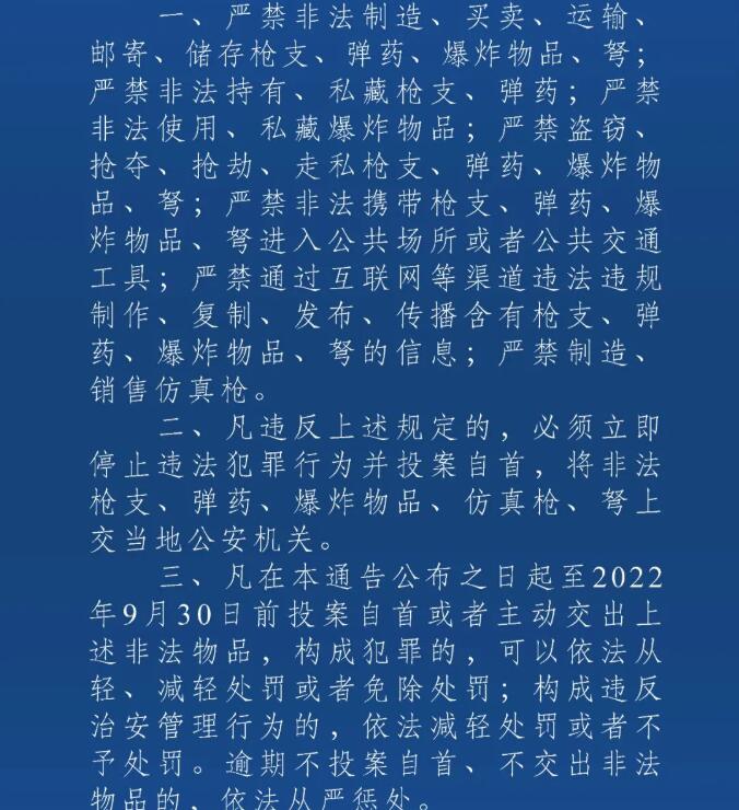 三、凡在本通告公布之日起至2022年9月30日前投案自首或者主動(dòng)交出上述非法物品,構(gòu)成犯罪的,可以依法從輕、**處罰或者免除處罰;構(gòu)成違反治安管理行為的,依法**處罰或者不予處罰。逾期不投案自首、不交出非法物品的,依法從嚴(yán)懲處。